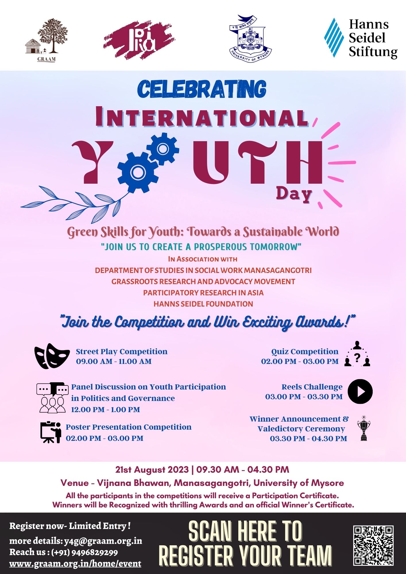 Commemorating the International Youth Day (IYD), under the aegis of the Y4G Fellowship, we aim to bring out youth’s voice to community issues and sensitize more young people on participatory governance. Towards this initiative, GRAAM in Association with the Department of Social Work, Manasagangotri, University of Mysuru, is planning the International Youth Day inviting active participation of youth from Mysuru.