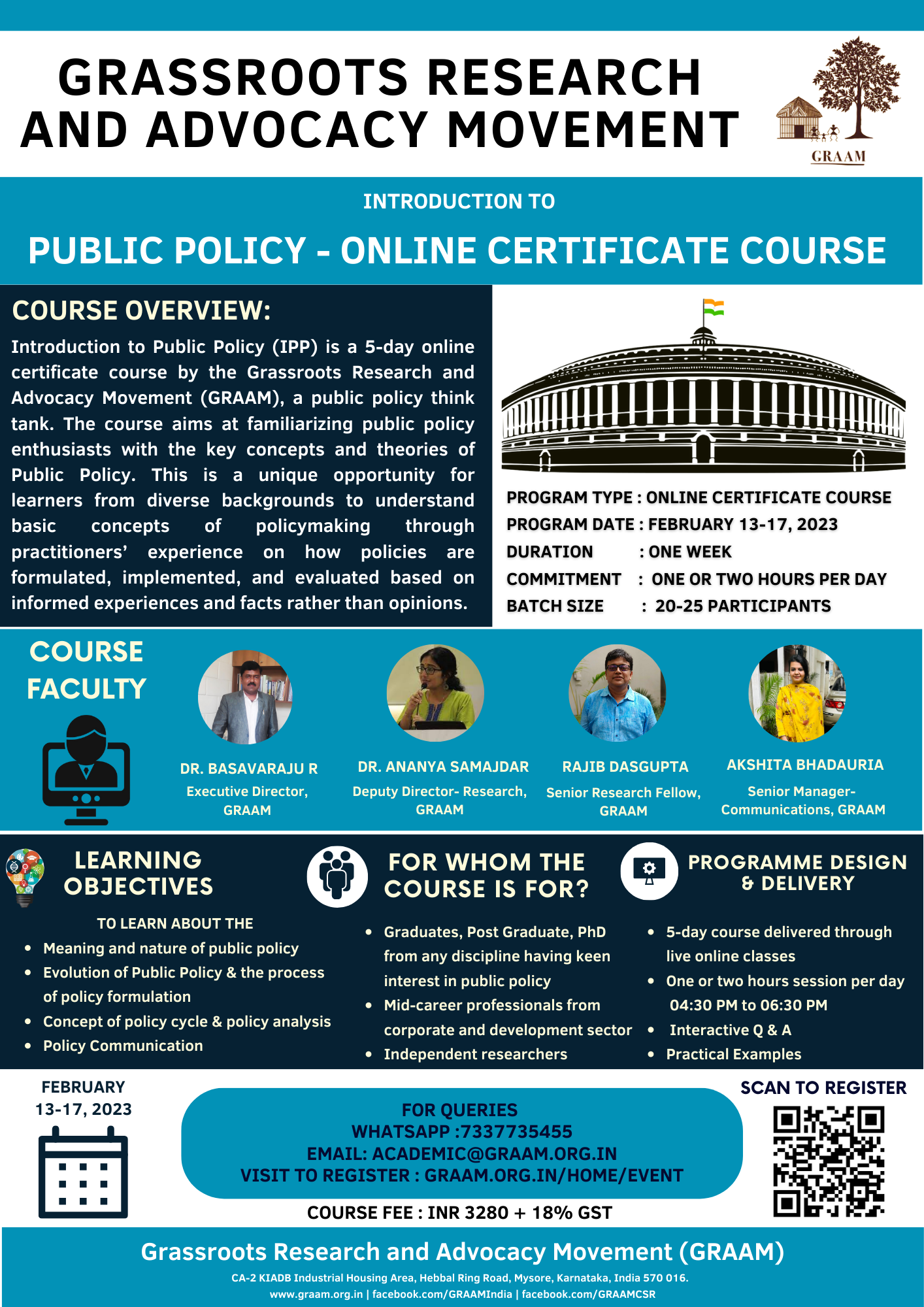 Introduction to Public Policy (IPP) is a 05-day online certificate course by Grassroots Research and Advocacy Movement (GRAAM), a public policy think tank. The course aims at familiarizing public policy enthusiasts with the key concepts and theories of Public Policy. This is a unique opportunity for learners from diverse backgrounds to understand basic concepts of policymaking through practitioners’ experience on how policies are formulated, implemented, and evaluated based on informed experiences and facts rather than opinions.
