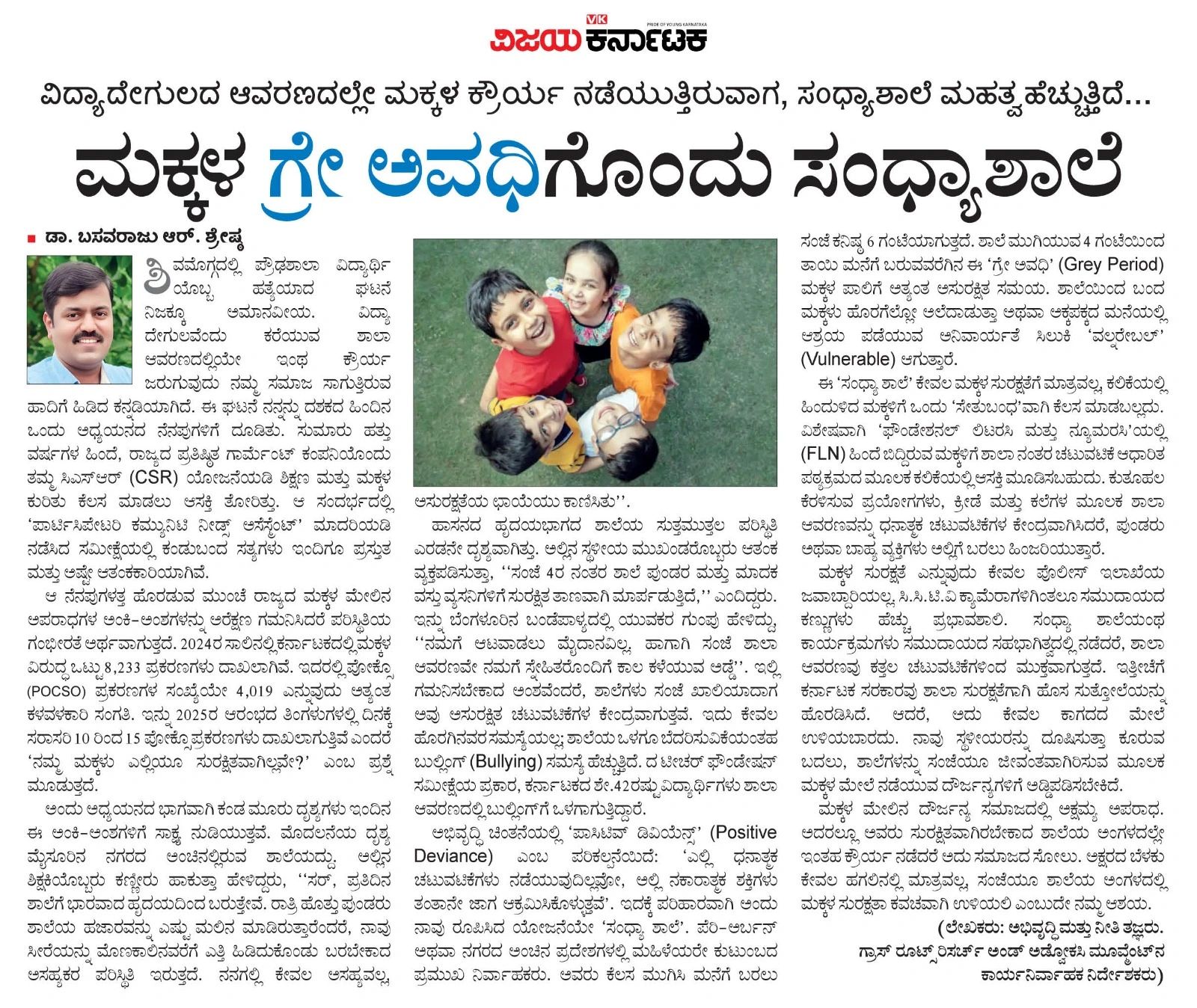 Our Executive Director’s latest article has been published in Vijay Karnataka, addressing a critical yet often overlooked gap in child safety: the “Grey Period.” The article focuses on the vulnerable hours between the end of the school day and the time parents return home from work, arguing that physical infrastructure like CCTV is no substitute for active community engagement.
