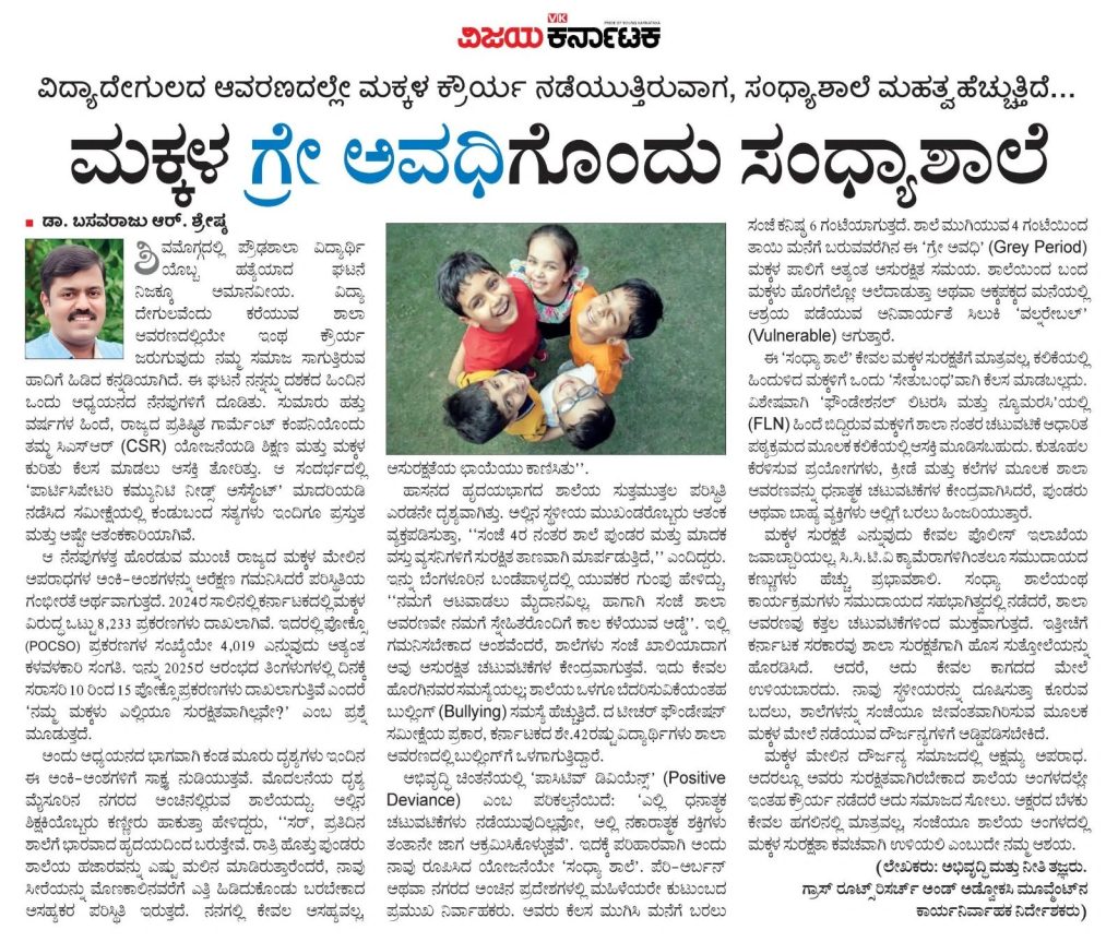 Our Executive Director’s latest article has been published in Vijay Karnataka, addressing a critical yet often overlooked gap in child safety: the “Grey Period.” The article focuses on the vulnerable hours between the end of the school day and the time parents return home from work, arguing that physical infrastructure like CCTV is no substitute for active community engagement.
